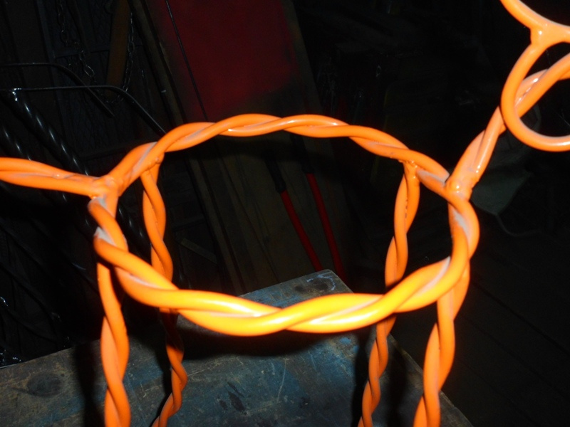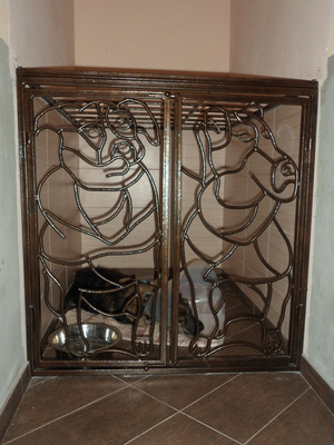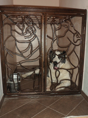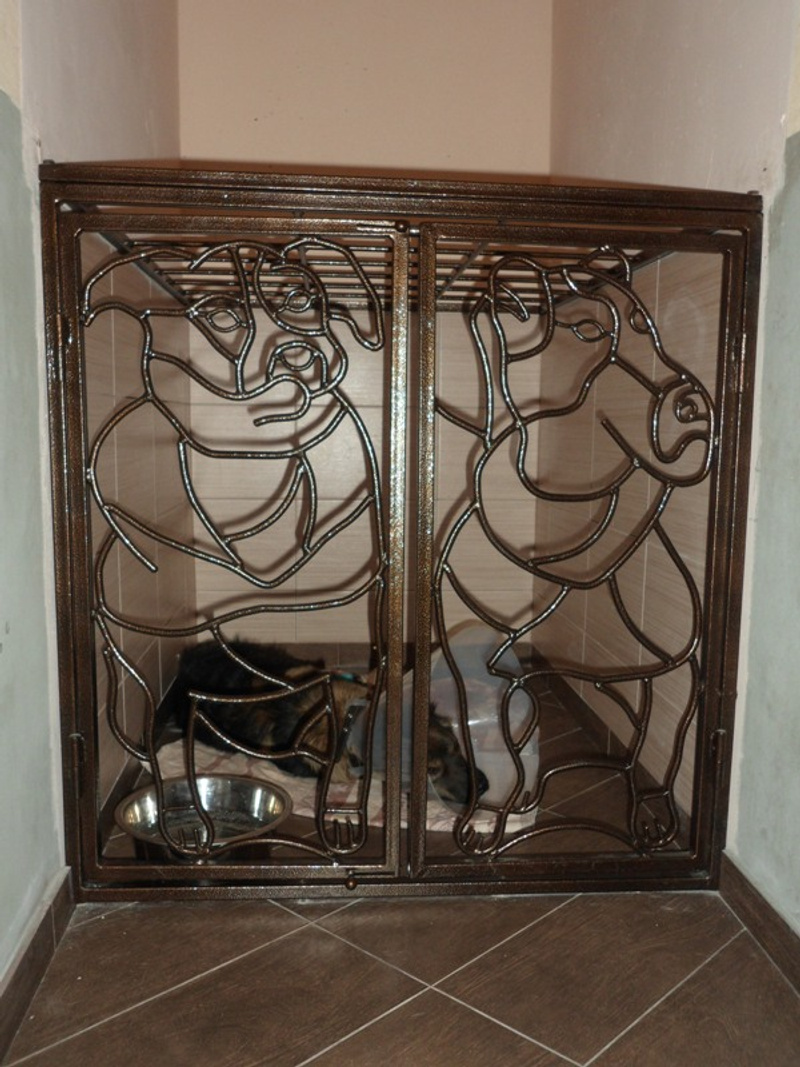 После всего, что было у меня сожрано, разорвано и тд. Я теперь хотябы спокойна. Эта клетка получилась эстетически красива, прочна на 100% (ни одна собака ее не сломает), отлично моется, т.к. внутри она из плитки и достаточна по размерам. На дверях изображение Ника и Мергены из металлического прута десятки. Если вдруг кого заинтересует, могу подсказать контакты человечка, кто делает такую красоту. и еще много всяких вещичек, типо подцветочников в форме кота. И все это из кованного железа.