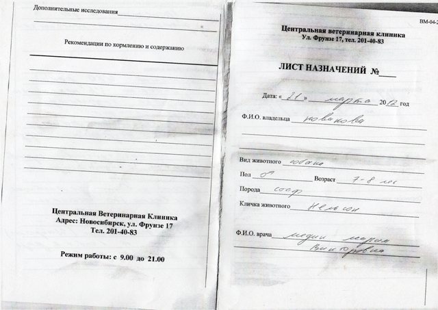 Да сегодня был долгие день. Сначала познакомились с Олесей, передержкой втроем поехали забирать Нела в "Сириусе", по пути хотели заехать к Тотошке взять у него клетку Оли, точнее остатки этой клетки, которую разнес в хлам Айк, когда жил у меня. Но как оказалась, Тото уже освоился, и когда Света (передержка) оставила его на 10 минут одного разнес всю кухню. Им без клетки тоже никуда. И тут у нас наступил тупик, потому что для Нела тоже необходима была клетка. Если бы не Лена, не знаю, что бы мы делали. Потом мы поехали в ЦВК, обработали лапы, сдали анализ на грибок в ухах, почистили их... там был просто тихий ужас. Да обработка ран была сегодня серьезная, вытаскивали мертвые волоски которые были под кожей... И Нелу это очень не нравилось, отрывали засохшие коросты, в общем держали его вдвоем с Олей. Но когда мы добрались до яичек, тут как у любого мужика у него началась истерика. На них коросты, кровавые ранки, сказали наблюдать и обрабатывать, но это он и не дает делать.... Плачет как ребенок. Возможно это от обморожения, может пролежни. А еще Нельсон знаменитось, мы пока сидели в ЦВК подошла женщина и сказала, а это и есть Нельсон я о нем на форуме читала!!!