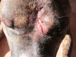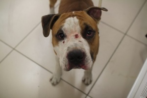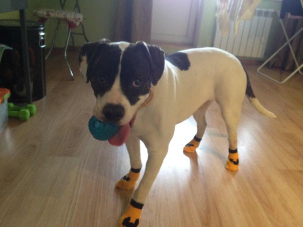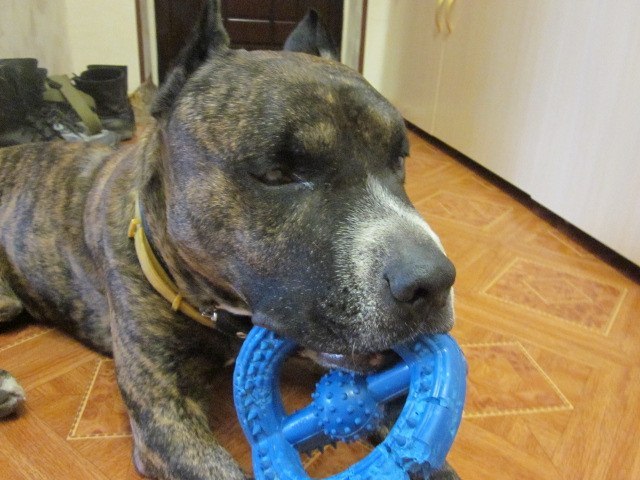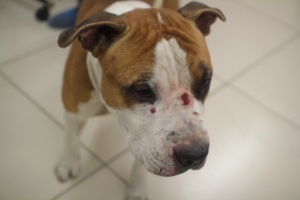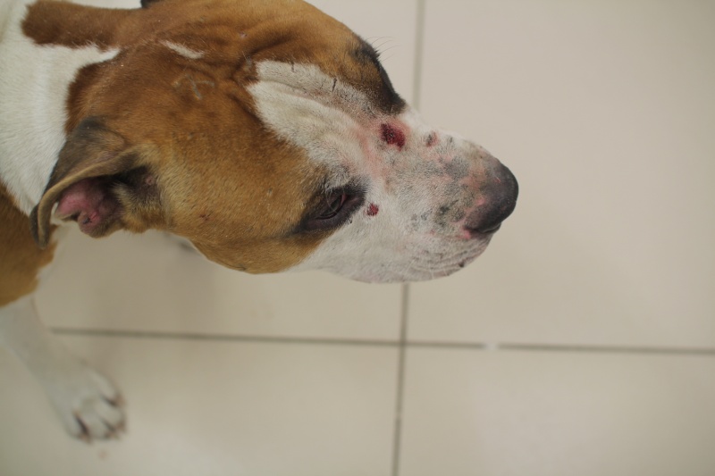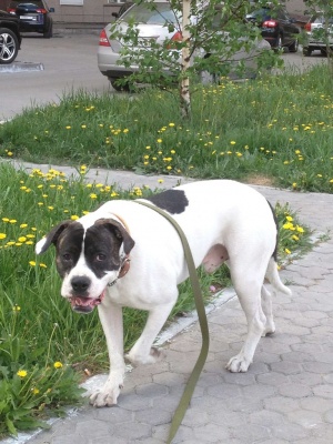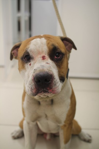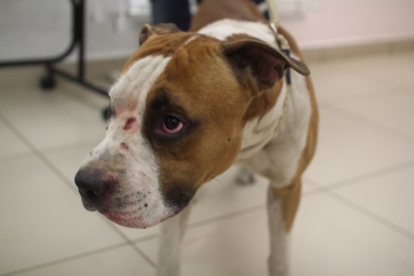 Мальчик действительности оказался стаффом, молодым год - два. У него истощение, торчат ребра и виден позвонок, жуткая аллергия, и вся морда в шрамах свежих и в кровавых ранах. Скорее всего он дрался с собаками. Сейчас нам дали неделю на реабилитацию собаки и на его отъедание. Потом нужно сдавать все анализы. У него увлечение простаты, и возможно отморожены яйца. Опухшая морда. Нужно сначала, что бы собака оклемалась. Так же два дня тщательного наблюдения, так как у собаки может быть пираплазмос.
