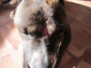 Нэльсон живет на бесплатной передержке у замечательной девушки Юли. У него куча болячек которых мы лечим от стафилакока до аспаргелеза и еще несколько видов грибов. У него конский хвост, делали ренгент. Отрезали шишку ему на хвосте, стал раздирать. А на днях его покусала собака и у него случилось страшное от гноя разбухла голова. Сейчас постоянно возим в ЦВК на промывки.