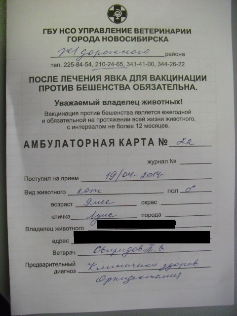 И да, в случае, если Вы будете лечить животное на Ленина, 18, то нужно брать чек и амбулаторную карту, где расписаны все манипуляции с животным. Это касается только вет.клиники на Ленина, 18.