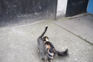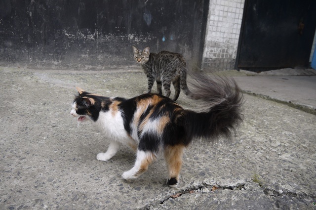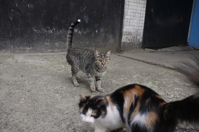 Котятам очень опасно находиться там. Трёхцветку удалось отловить, а полосатик более пугливый подходит не ближе, чем на шаг-два, при малейшем движении сразу пятится и убегает.Худенький такой ребёнок. Пока только могу кормить его. Для него очень нужна помощь кураторством или сокураторством, одной мне уже не потянуть ещё и его.