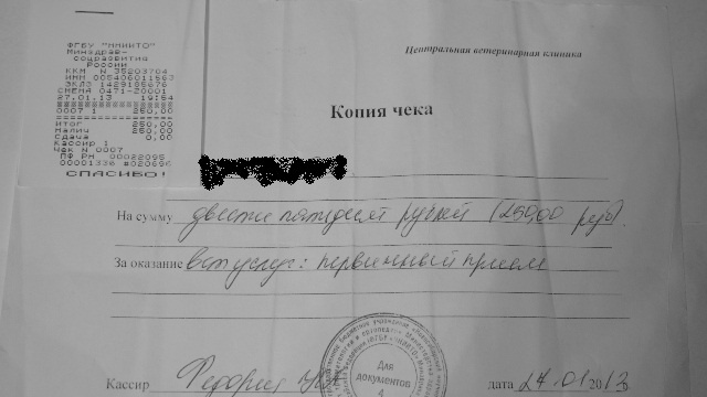 2)Чек 2 (первичный осмотр полосатому Васятке) – 250,00 руб