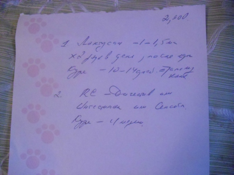 По-прежнему под лампой Вуда светятся две волосинки у кошечки. Рекомендовано продолжить мазать фунгином и на осмотр через две недели. В ушках имеется отит, назначен Суролан и чистка ушей каждый день. Кишечник ещё раздут, но уже не так сильно. Сказали продолжать поить не менее месяца биовестином-лакто.