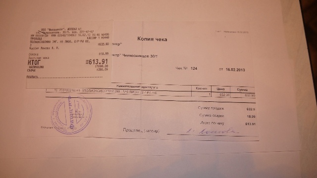 1)Чек 1 (Полиоксидоний) – 613,91 руб