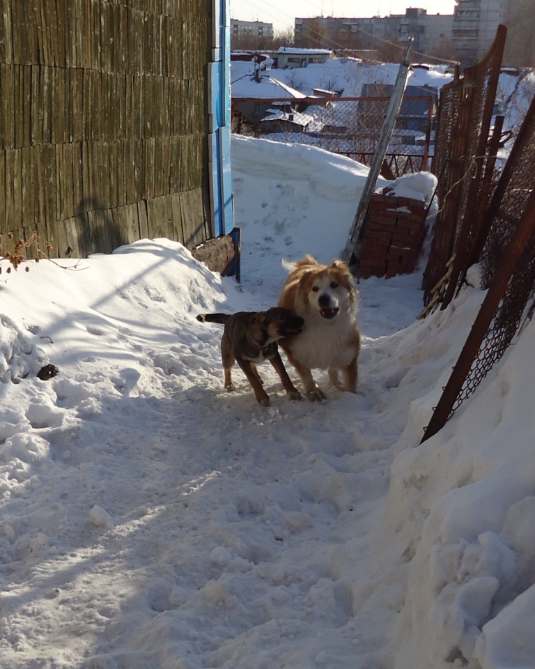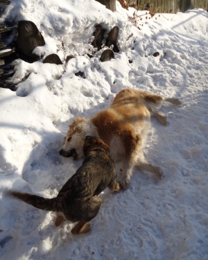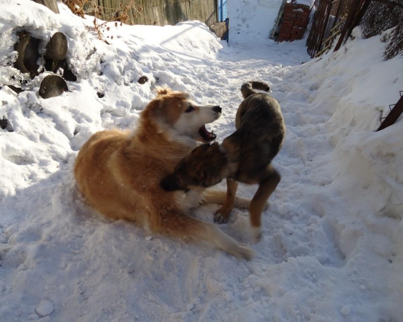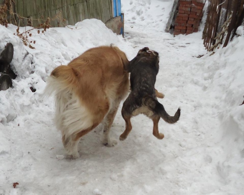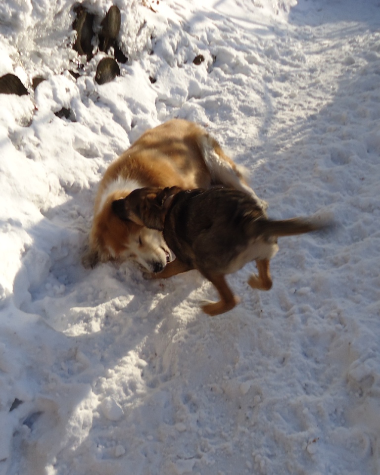 Они носились, как два мамонта, снося маму с Федькой в снег. Муха так умотала Джельку за 20-30 минут, что та зарывала мордочку в снег, прятала ее от этой мелкой террористки, вжималась в сугробы... Под конец Джелька просто легла на бочок, закрыла глазки и молча терпела этот кошмар