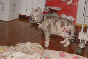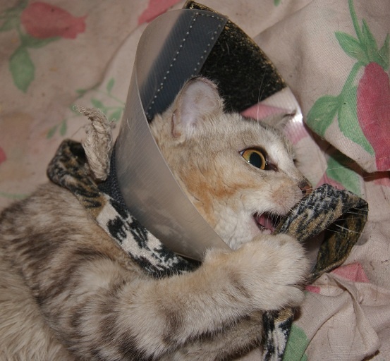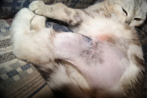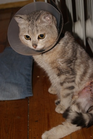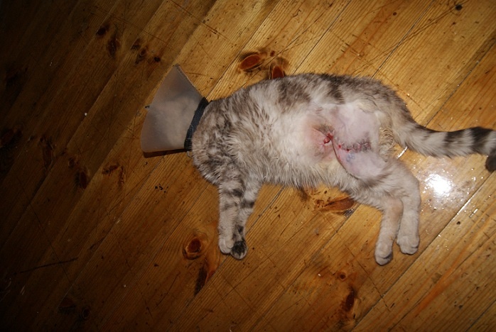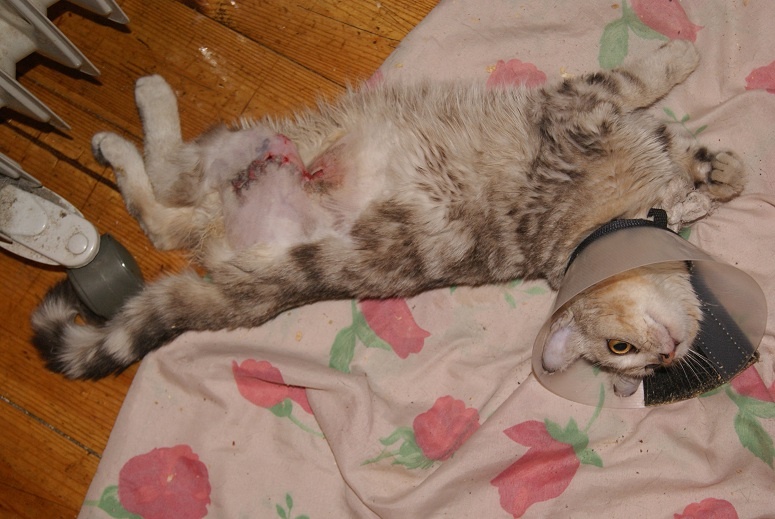 Кошечке лучше, больше не закладывают салфетки, не ставят уколы, просто промывают швы и закладывают мазь. Сейчас сами будем обрабатывать утром и вечером. Швы пока не сняты, снимут когда получше всё срастётся. Немного фотографий, кот боится кошечку, прячется там, где она его не достанет