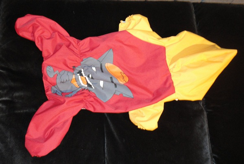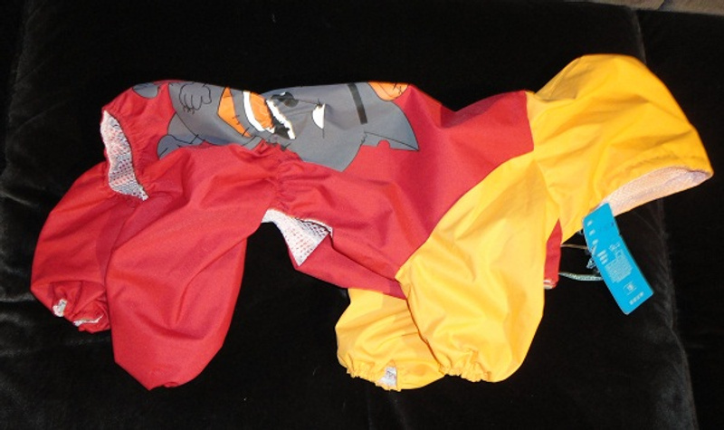 1. Дождевик на небольшую собачку- кобелька (моему скотчу маловат), новый, но сломалась наружная заглушка для кнопки, сама кнопка рабочая (поменять ее недорого, просто у меня нет времени