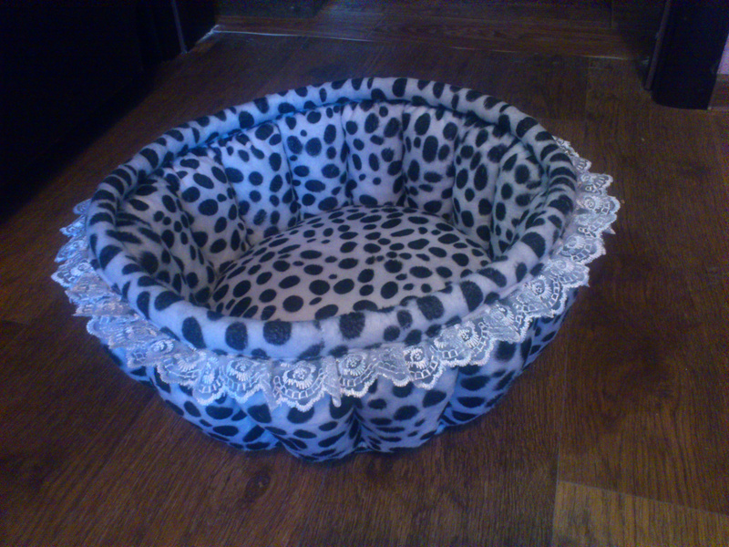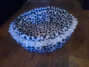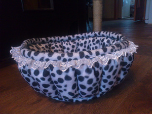 Корзинка для кошки. Материал - мех искуств. с коротким ворсом. Отделка - кружево. Диаметр дна внутри 30 см, высота бортиков 15-16 см, диаметр по верху 39-40 см. Новая.