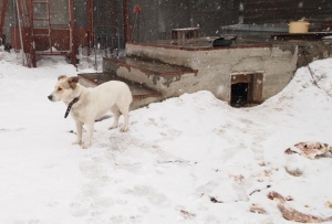 Большую часть времени Беляшик сидит на цепи, но родственники приезжают несколько раз в неделю и с ним гуляют в лесу. С него требуется "разговаривать" с бабушкой, чем он и занимается не без удовольствия, поскольку признает только ее и ее дочь. Остальных, к сожалению боится, что и видно на фото. Живет, увы, замкнуто. Зато к нему не предъявляют требований по охране, к которой он оказался непригоден.