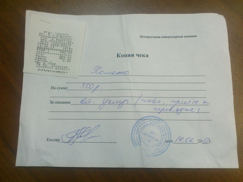 Прикрепленные файлы - чек за прием в ветклинике (прием 16 мая) и расписка на оплату передержки