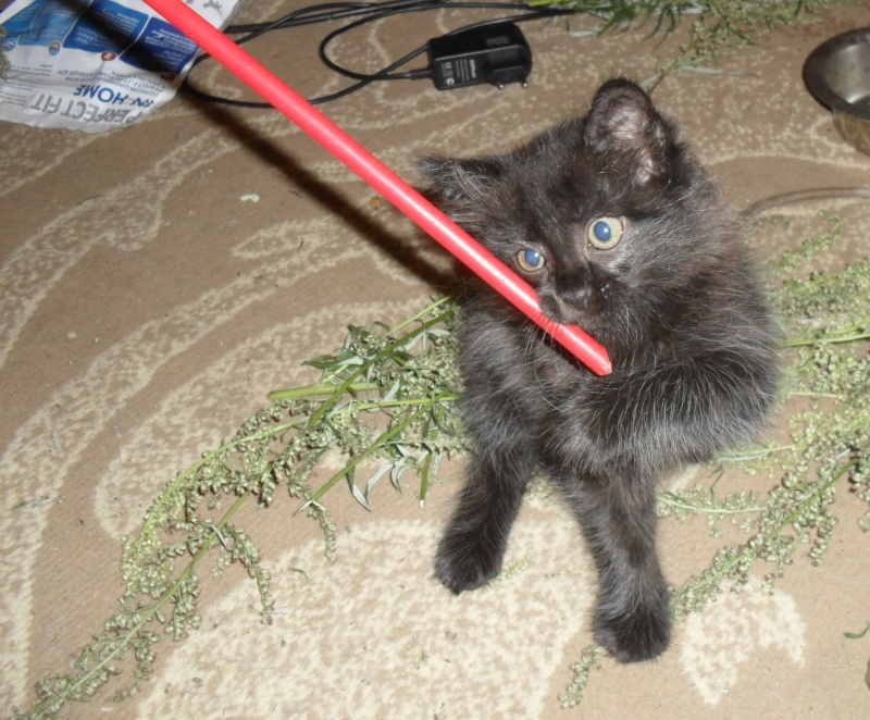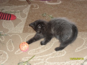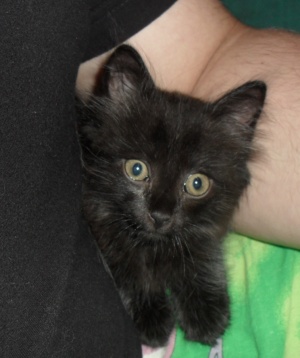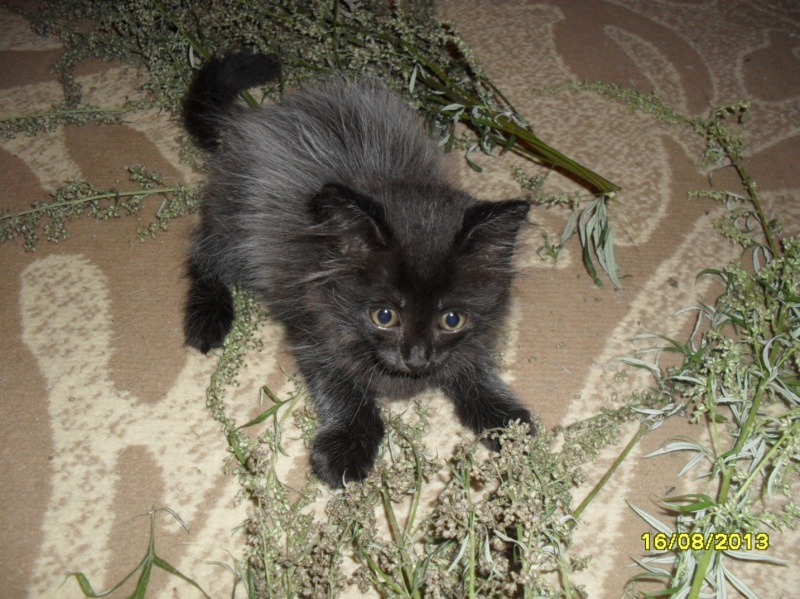 У нее интересный окрас - вроде черная, но всю спинку покрывают длинные серебрянные волоски, этакий эффект чернобурки. Смотрится очень даже красиво, хотя возможно потом они вылезут и будет просто черная длинношерстная кошка.