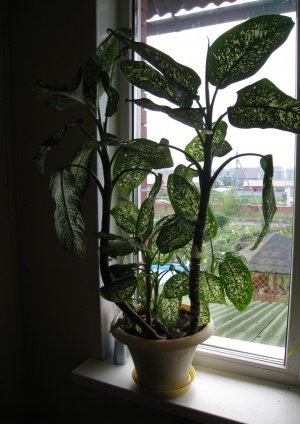 №4 Диффенбахия. Большие стебли уже без листьев снизу. Но в горшок досажены молодые черенки – за счет них есть некоторая густота. 100 руб. Дорастает уже почти до верха окна.