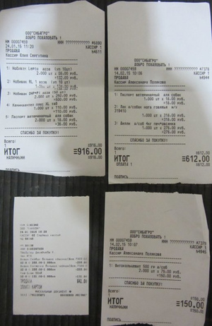 Чеки№ 2,3,4,5- 916+61+641+150= 2319руб.