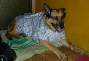 Дайночка очень умная, понимает что я от нее прошу, но чисто психологически не хочет делать дела дома, так как никогда за всю жизнь не делала такого.Позавчера поняла что уж мы ее на покрывале собрашись выносить-а ей больно в скрюченном состоянии...вот уж и посикала что бы не несли ее.Вчера прикрикнула команду быстрей-быстрей, и повторюсь она расстроилась очень, посикала, но прикрикивать больше не могу...