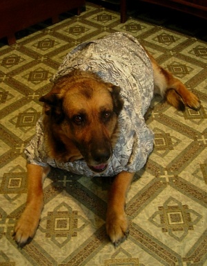 она же у вас к одежде привычная? вот я и имею в виду попонку или комбинезон с ручками...
