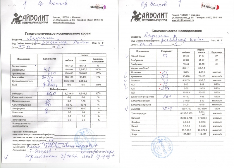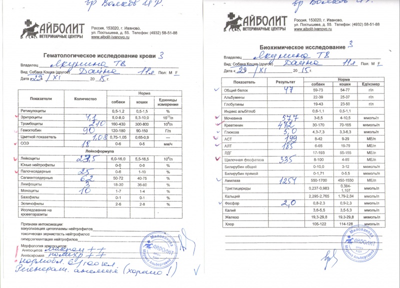 Листа назначения нет, завтра возьму, так как в воскресенье я ее отвезла и когда уехала анализы были не готовы.Началось с того что ее вырвало едой вечерней и было немного переваренной крови.Превикокс отменили и все лекарства, сделали один укол мелоксикама вечером, она кушала сама.На следующий день с утра текли слюни бесперестанно и рвало, стали давать фосфолюгель,, рвота прекратилась, слюни повторялись.Кушала.В воскресенье ее вырвало с утра переваренной кровью, в это время как раз разговаривали с врачем, он сказал превозите если есть возможность.Собрались за пол часа, в клинике уже были в обед.Под вопросом почечная недостаточность, но толком пока не известно на фоне чего такое состояние.Моча хорошая, вчера брали.Кровь в воскресенье.Сегодня сделают рентген, возможно от застоя в легких или на фоне сердца или на фоне простуды или инфекции.Вчера начали колоть антибиотик ветеринарный байтприл, капельници два раза в сутки по 4-5 часов, вводят медленно что бы не нарушить баланс, колят эссенциале, чегото для поддержки сердца, аксиданты-что точно могу сказать только завтра когда выдадут назначения.В клинику звонили с форума, разговаривали с врачем нашим по назначениям, звонила тоже врач, очень переживает за Дайночку.