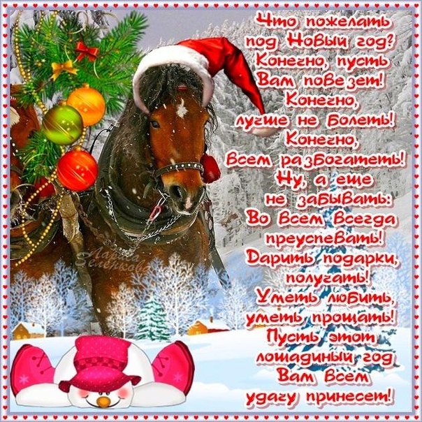 Девочки и мальчики! А так же их родные, близкие и питомцы. Всех-всех поздравляю с Новым годом. Желаю в год Лошади, чтобы рядом с вами в упряжке были только надежные и верные люди, которые помогут вывезти повозку жизни в трудную минуту и не попортят вам борозды. А все горести и печали чтоб с возу упали.