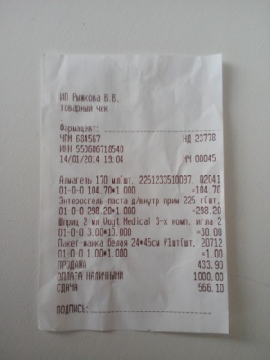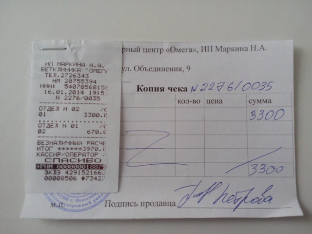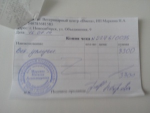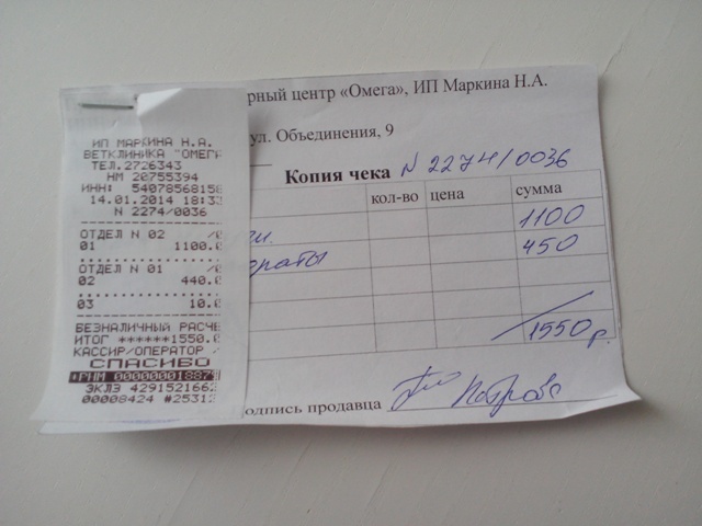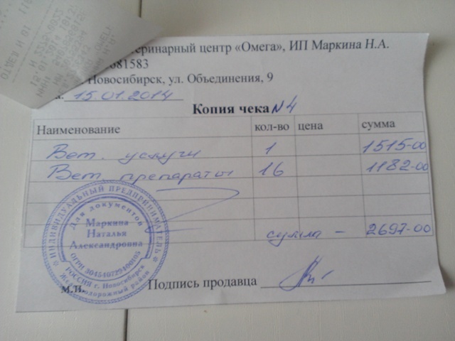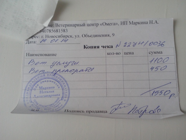 Анализ кала,крови,прием в Ветлекаре,корм,лоток и прием от 17.01(утилизацию) оплачивала сама,чеков не сохраняла. Тему прошу закрыть.