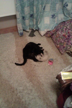 Про прикорм - пока один котенок гулял, он следил, что кошка делала - и даже попытался есть "взрослую" сушку. Размочила сушку водой и выпустила остальную детвору - куда там - теперь они дерутся и катаются:)