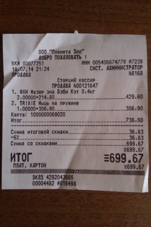 (Включила только частично расходы из чека: 272.00 наполнитель, так как корм вообще на чеке не виден).