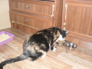 . Мирра хорошо кушает, по понемногу но часто. Завтра стерилизация, надеюсь что успеем и кошка не надумает рожать