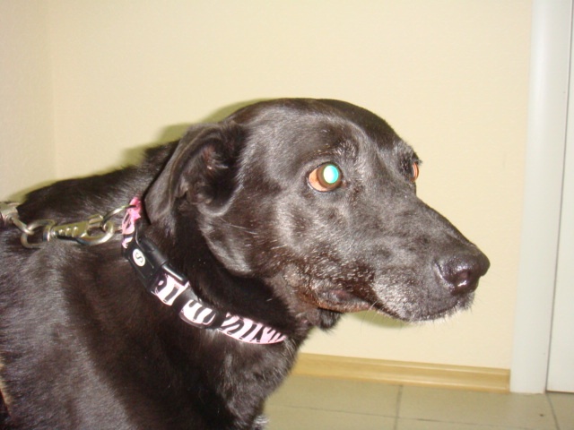 ). Лезет целоваться и обниматься ко мне, но когда я попыталась поправить ей ошейник, который мы ей как приличной собаке одели, она отошла от меня и общалась уже на расстоянии вытянутой руки.