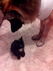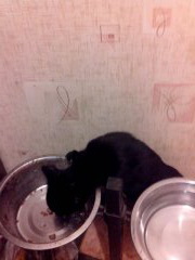 Здравствуйте, да, тему можно переименовать. Можно и так: Бороться за жизнь и не сдаваться. Или что-то вроде этого. Немного о наших любимцах. Цезарю ставлю уколы каждый день. Врач прописал восстанавливающий курс на месяц, даю витаминки. Швы еще не все затянулись.Котенка с клиники забрали с отитом. Воспаление было сильное, в ушках все хлюпало. Бедный котенок. Лечила тоже малявку. В ушки капала капельки. Сейчас получше, но не до конца пролечила. Назвала котенка Талисманом, кротко Тали, Талик, Талюня. Говорят, что черные коты приносят счастье. С появлением котенка в клинике Цезарю стало лучше. Я решила, что заберу подкидыша домой только с Цезарем. И забрала. Котенок быстро понял, где ему в туалет ходить, а еще быстрее понял, где ему кушать. Таскает у Цезаря еду)))))). Пьет из миски Цезаря, из своей не пьет. Видимо вода у Цезаря вкуснее)))))))). Погрыз мне дома цветы, засранец такой. Фотки, блин, не могу выставить. Цезарь и Талик полюбили друг друга. Талик задира, встает на задние лапки перед Цезарем и лапами перебирает, как боксер прям))). Забавно.