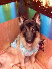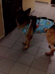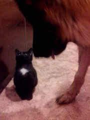 Цезарю 4 года. Талик носится за хвостом Цезаря. Поиграться ему всё надо. Один раз не рассчитал, близко подбежал к Цезарю, Цезарь в это время мне радовался, хвостом вилял и зацепил Талика. Представьте как Талик кубарем полетел