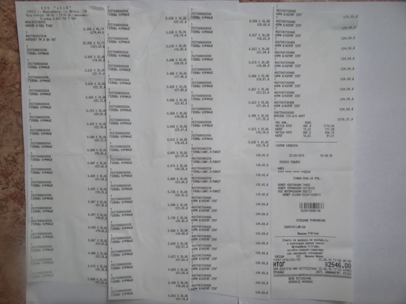 - Корм (головы цыпленка) – 1552,99 руб. (чек 2).