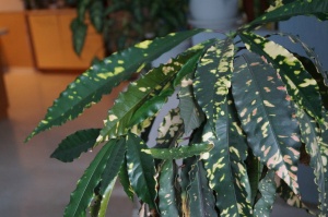 Кодиеум variegatum Undulatum (синонимы Piecrust, Mortimer) в большом горшке. Высота растения 70 см.