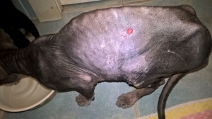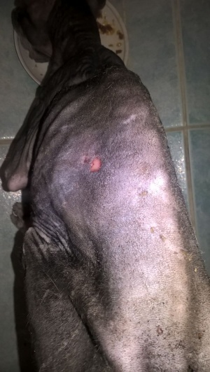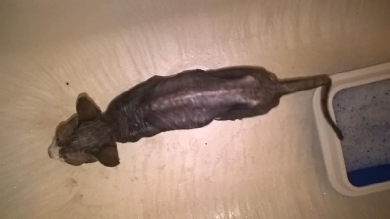 Уважаемые форумчане, очень просим помощи для найденного сфинкса! Вчера вечером забрали из подвала кастрированного мальчишку. Сказать худой, это ничего не сказать. Худой и весь подранный. Когда его взяли на руки, на боку увидели дырку, из неё сочился гной, блохи просто ходили пешком. Жалко мальчишку до боли в сердце. Отмыли его, он даже не сопротивлялся, накинулся на воду, выпил наверное литр))) Придимается, заглядывает в глаза, много кушает. Сходил в горшок, хорошо.