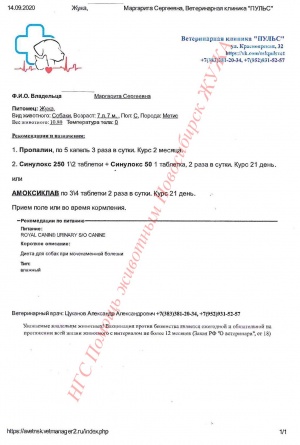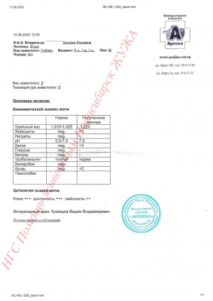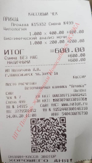 – Оплата биохимического анализа мочи и цитологии осадка на 14.08.2020 в ветклинике "Арника", ул.Зорге, 1а – 600.00ք [чек №50]