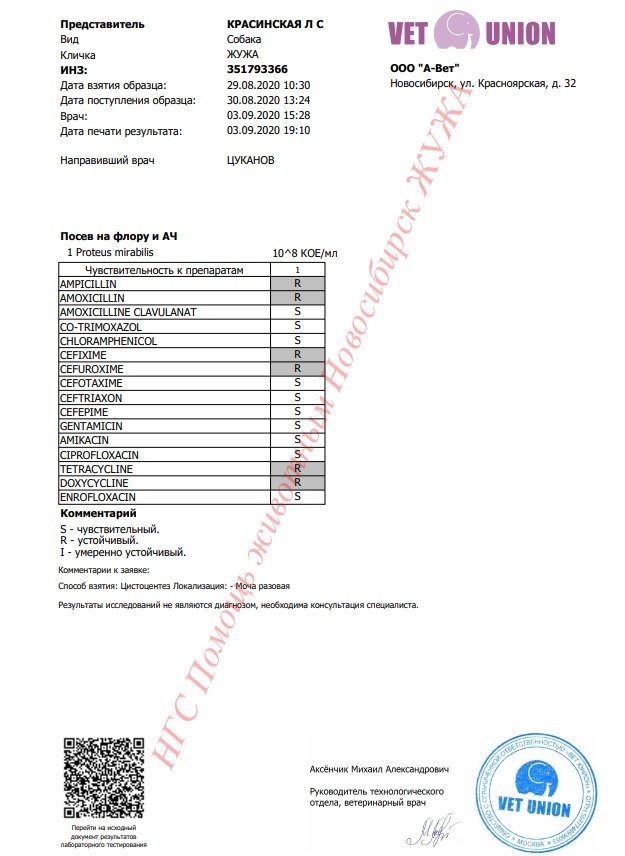 Врач в Арнике, который вынес результат, сказал что надо делать цистоцентез с подбором антибиотика. Поэтому буду записываться к Цуканову, что он скажет. Может ещё спецкорм надо подавать.
