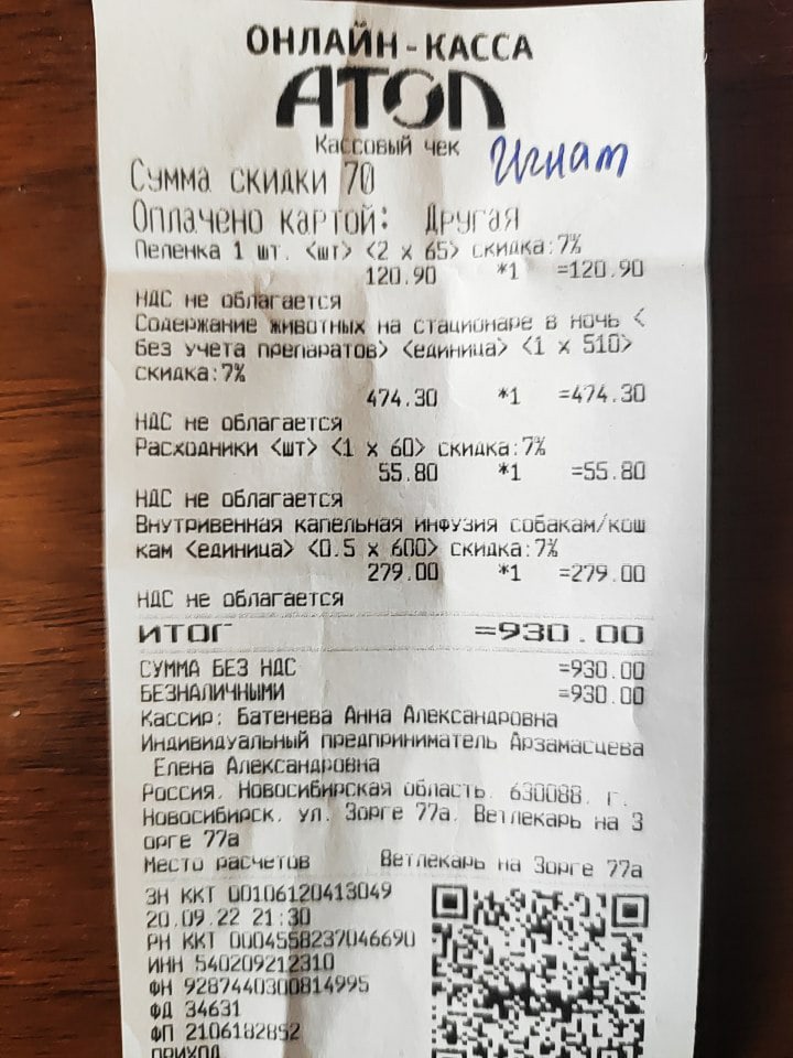 1. Ветеринарные услуги Игната на общую сумму: 930руб. ( 20.09.2022г. )