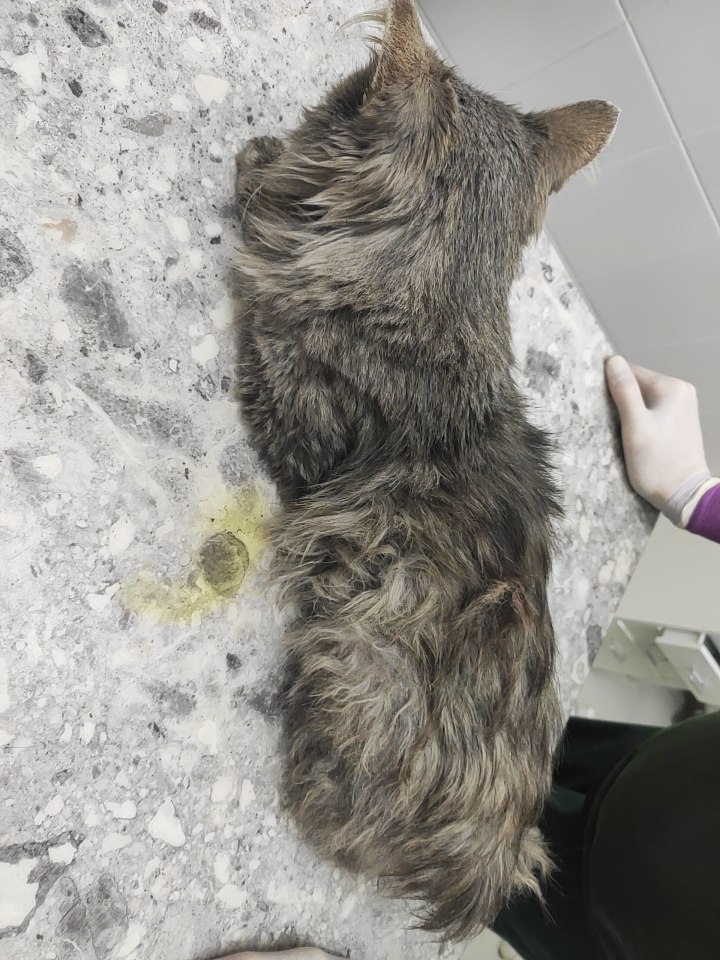Мне сегодня поздно вечером позвонил знакомый, нашёл в пакете старенького избитого котика. Молодые ребята, свидетели, сказали, что видели как пьяный мужчина пинал пакет. Развернули, а там кот в тяжелейшем состоянии. Мы отвезли его в клинику, кот старенький, сильно обезвожен, прям каменный, глаза не открываются, блохи по нему кишат. Хвост обрублен, от кота исходит тяжёлый гнилостный запах. Сейчас кота Игната оставили на стационар примерно на трое суток. Ему будут ставить капельницы, делать поддерживающую терапию, там будет видно. Шанс доктора дают.