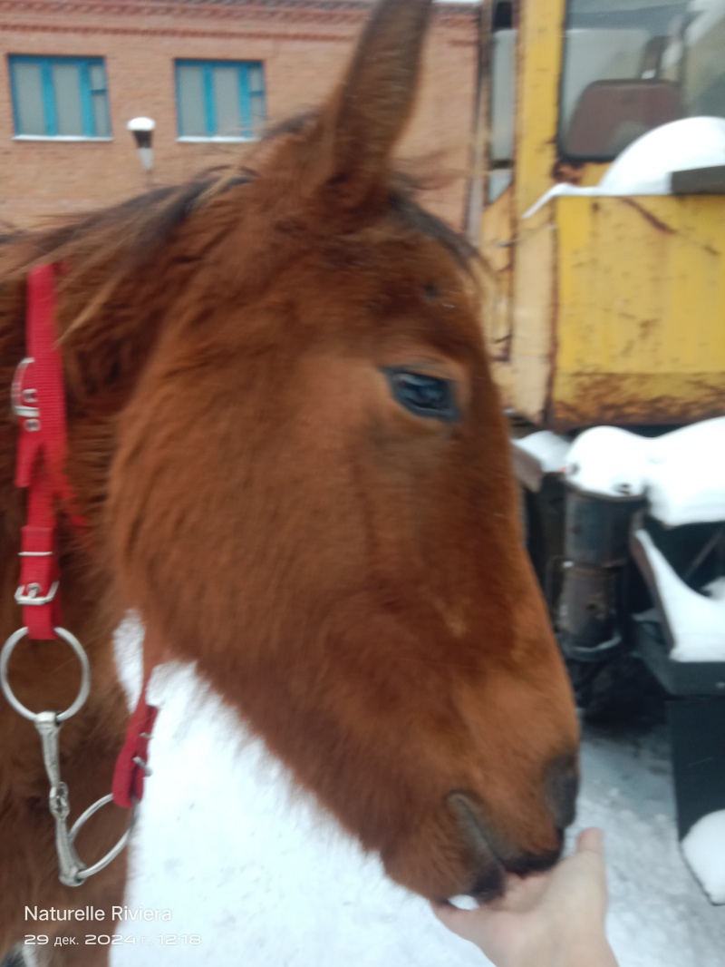 , общительный, за нами хвостиком ходит. Угощаем его яблочками и сухариками. Всё таки лошади волшебные животные, люблю их, как и собаки и котики.