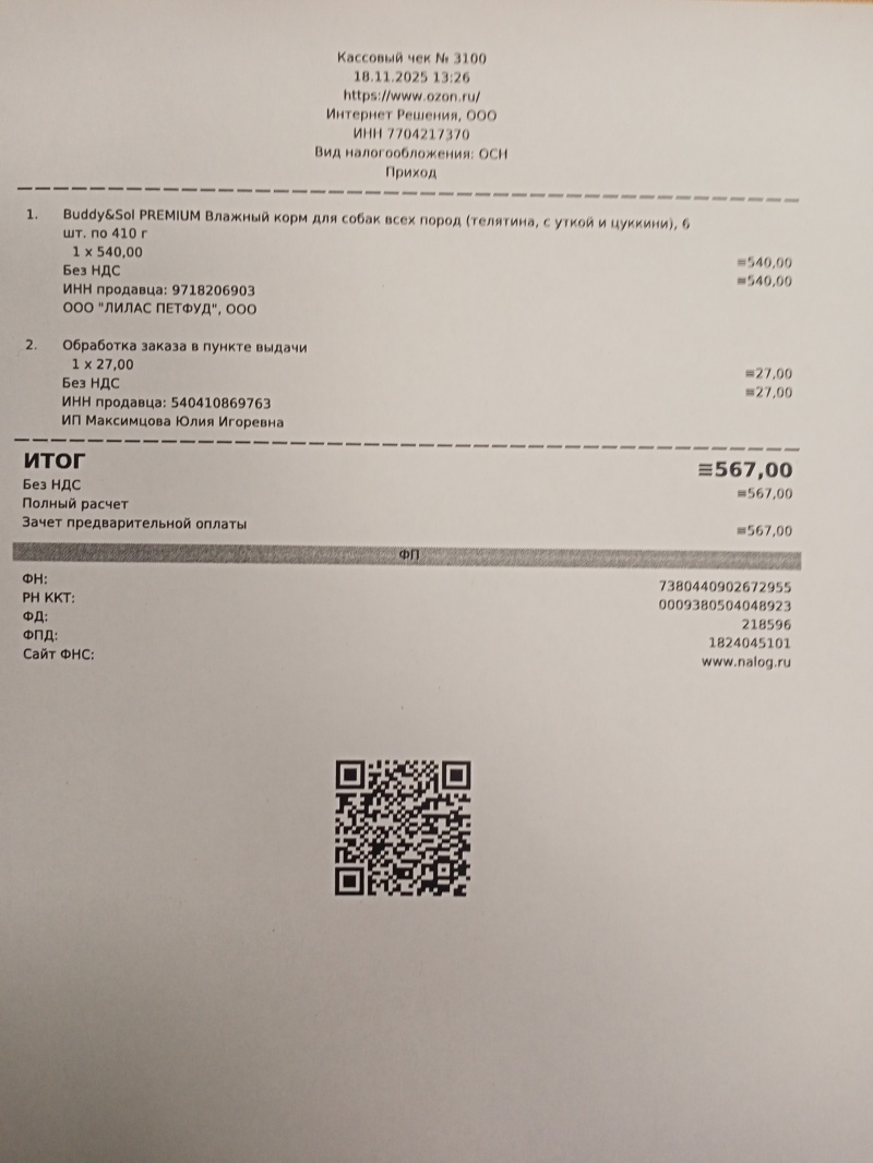 18.11.25 корм - 567,00 руб. (фото 1) консервы собачьи, но покупаю кошкам;