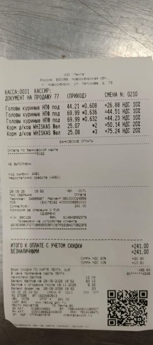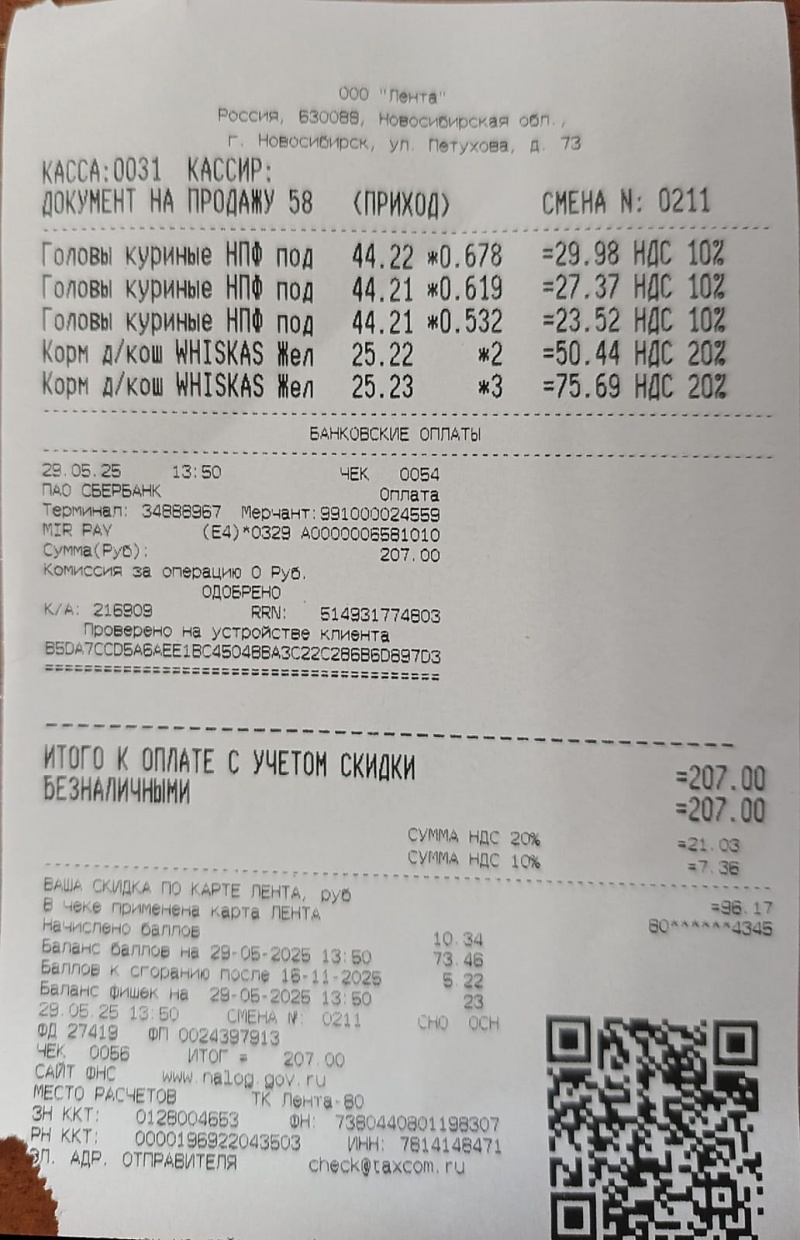 6. Головы куриные + корм для кошек паучи " Вискас " на общую сумму: 241руб.