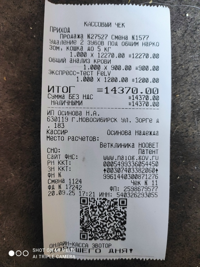 1. Ветеринарные услуги котика Коти ( удаление зубов, анализы ) на общую сумму: 14,370руб. ( 20.09.2025г. )