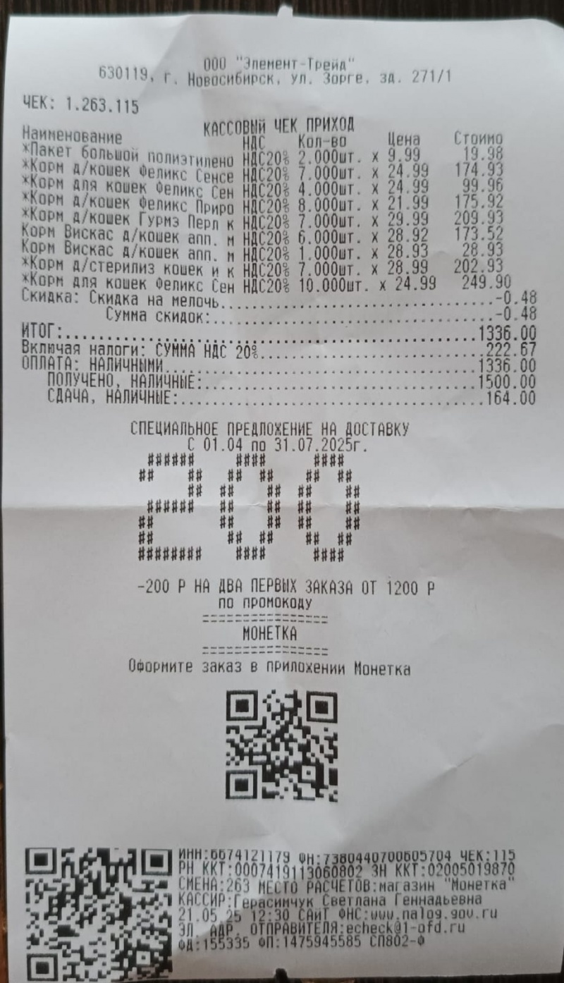 2. Корм для кошек паучи " Феликс ", " Гурмэ ", " Вискас " на общую сумму: 1,336руб.