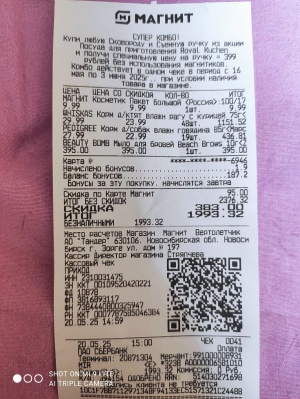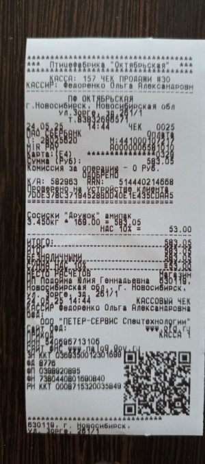 3. Сосиски для животных " Дружок " на общую сумму: 583руб.