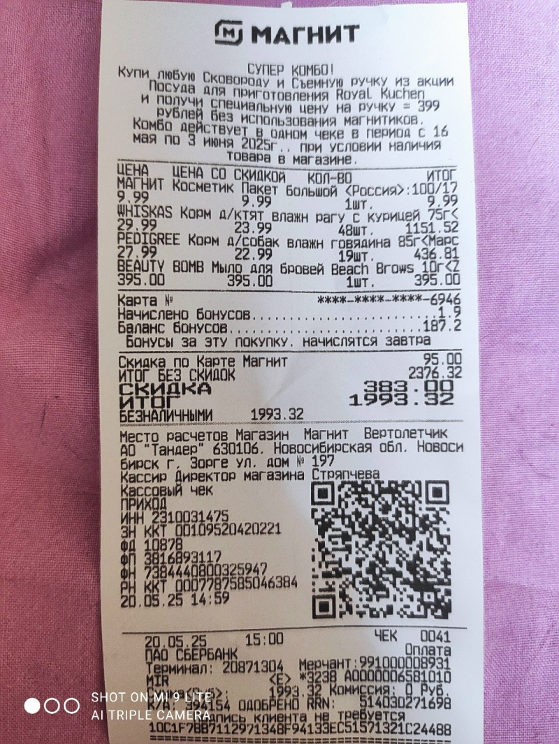 5. Корм для кошек паучи " Вискас " на общую сумму: 413руб.