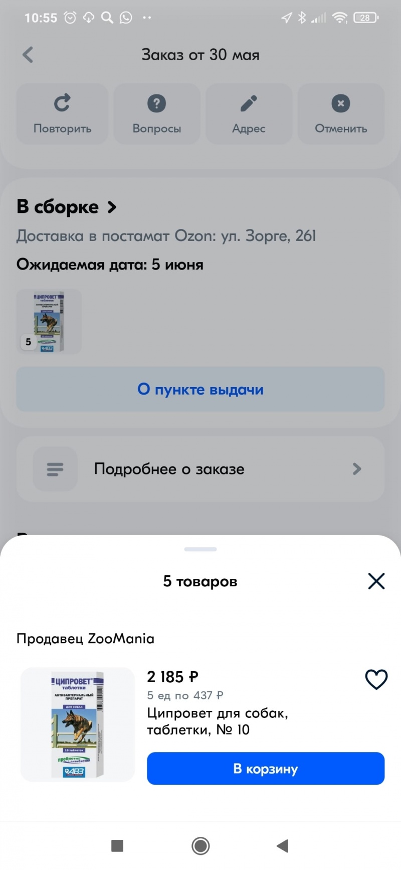 4. Антибиотик ветеринарный " Ципровет " 5шт. на общую сумму: 2,185руб. ( заказ на Озоне )