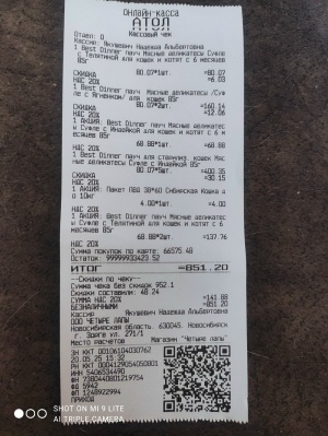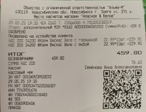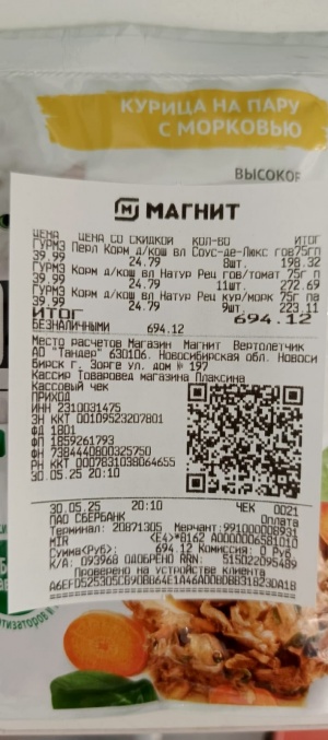 1. Корм для кошек паучи на общую сумму: 459руб.