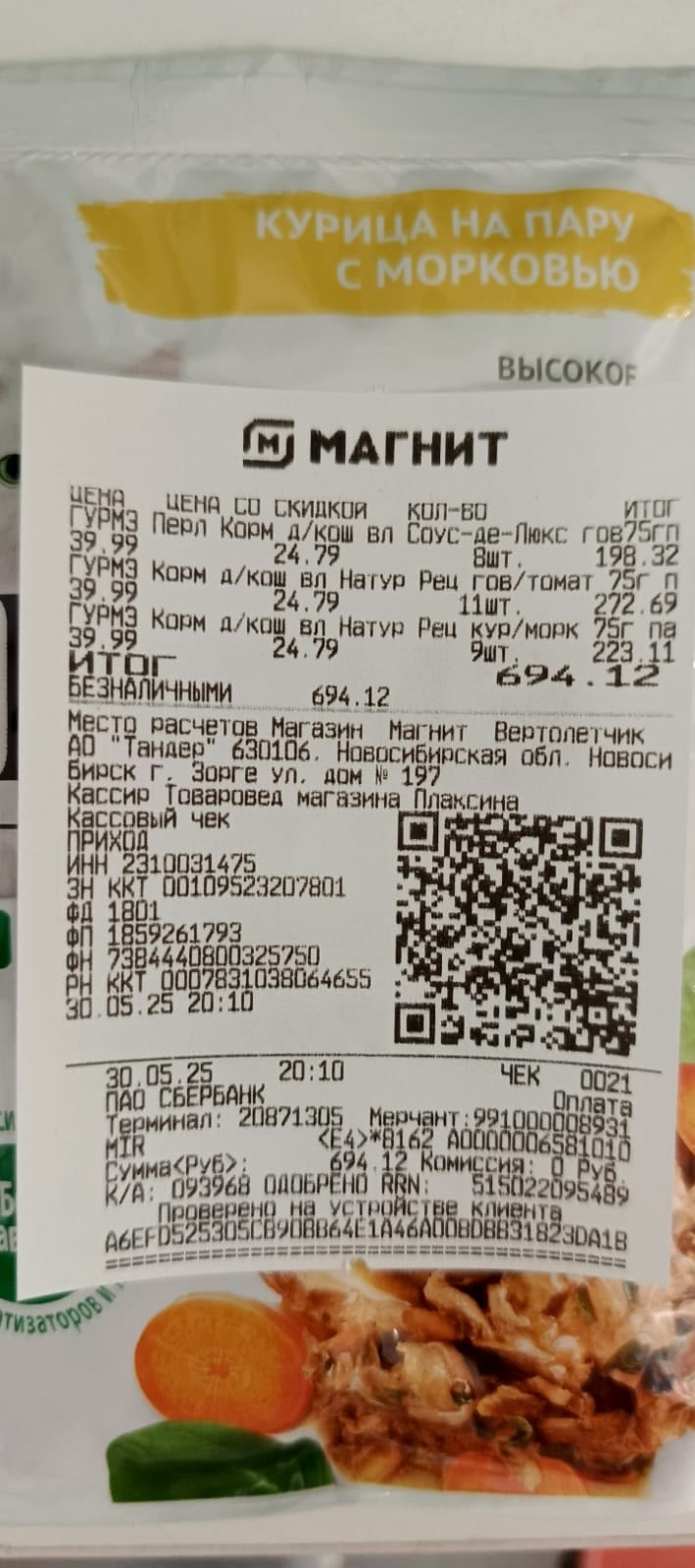 8. Корм для кошек паучи " Гурмэ " на общую сумму: 694руб.