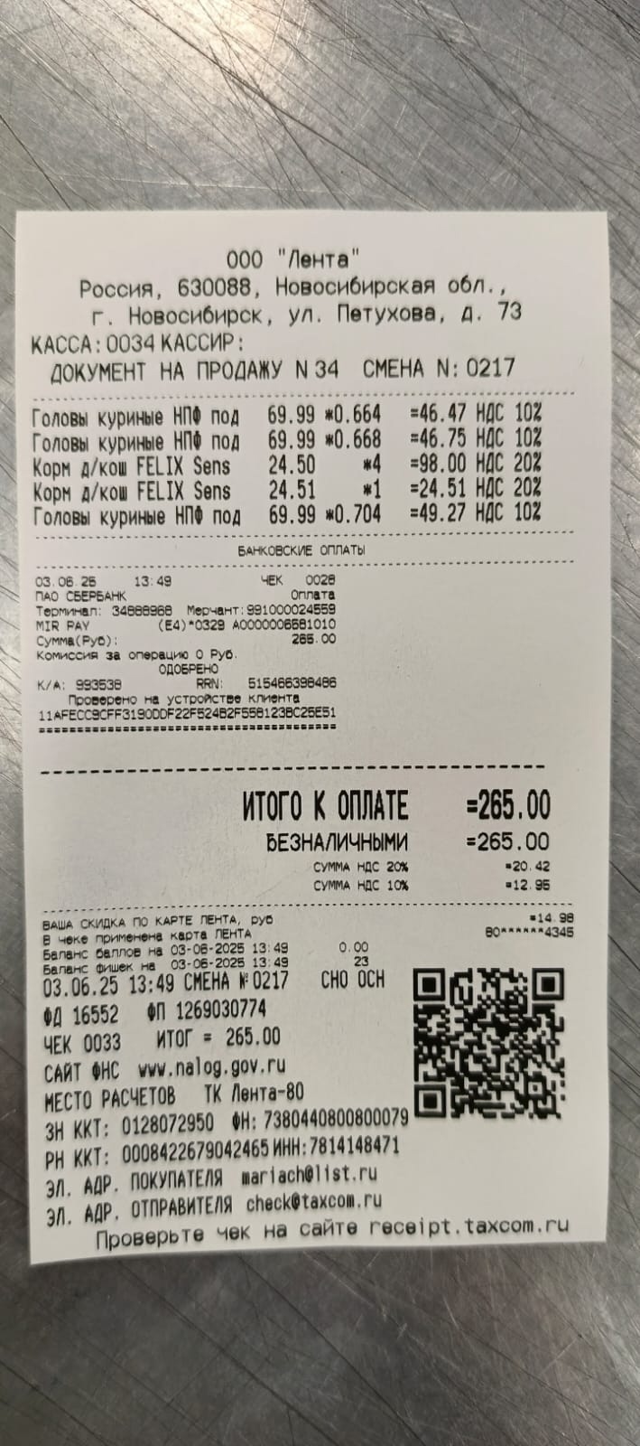 10. Головы куриные + корм для кошек паучи " Феликс " на общую сумму: 307руб.