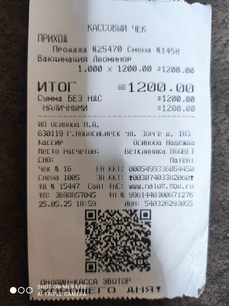 15. Вакцинация от лейкоза котика возрастного Максима на общую сумму: 1,200руб.