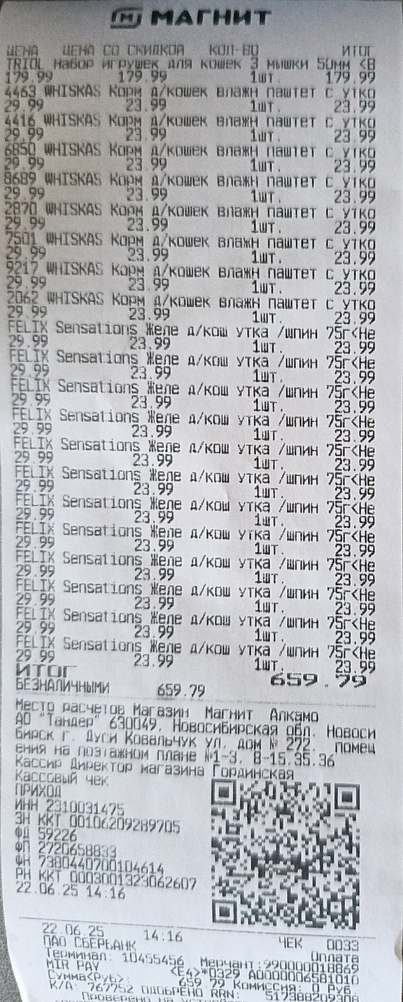15. Корм для кошек паучи " Вискас ", " Феликс " на общую сумму: 659руб.