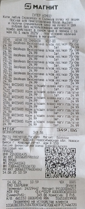 14. Корм для кошек паучи " Вискас " на общую сумму: 349руб.